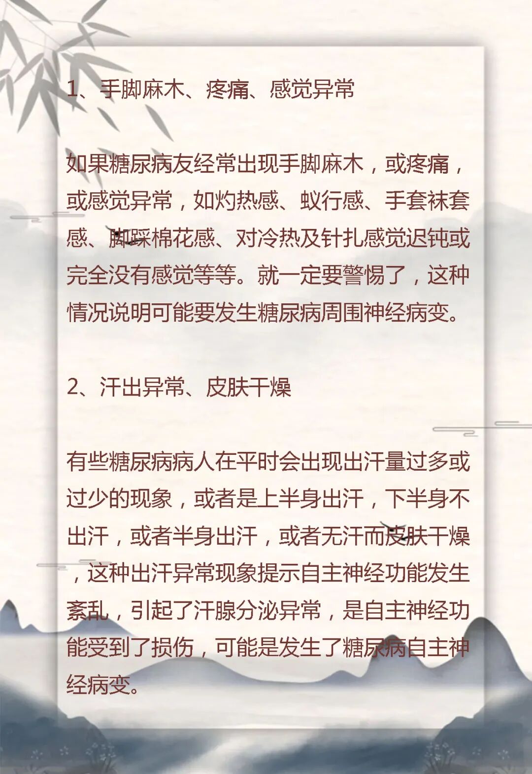 众所周知糖尿病不可怕,可怕的是糖尿病并发症,的确糖尿病并发症是导致糖尿病患者致残致死的主要原因,虽然我们无法预测并发症什么时候会出现,但并发症也不是无迹可寻的,因为任何事物的发展都有一个循序渐进的过程,糖尿病并发症的出现也不是一下子形成的,在出现之前总有一些先兆,或者说身体总会发出一些预警信号。
